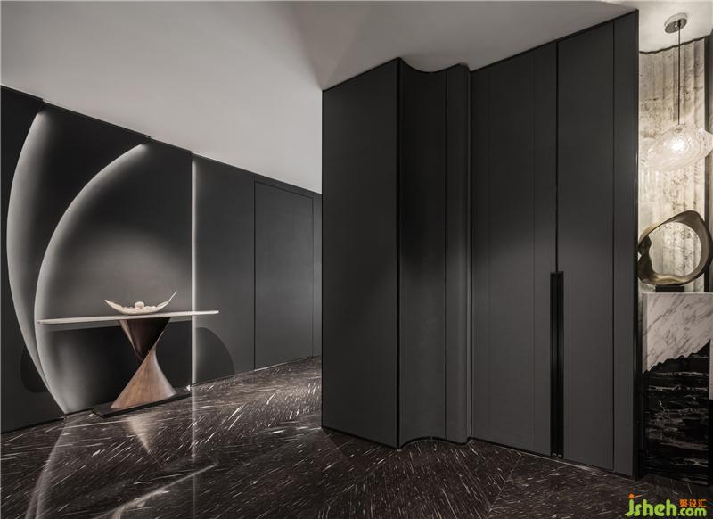 從玄關開始,如海浪般激蕩的線條結合燈帶舒展有致,預示了整個項目的基調。在2.4米的有限層高上,客餐廳采取尺寸、形態(tài)不規(guī)則的圈頂打造層次,白色圈頂?shù)膶盈B形式彰顯縱深感,與地面的鏡面深色大理石相對比,營造出天與海效果,讓層高得到最大化體現(xiàn),使整個客餐廳將西廚、餐區(qū)、酒吧形成大氣而流暢的連貫性。