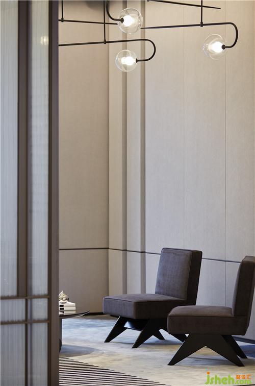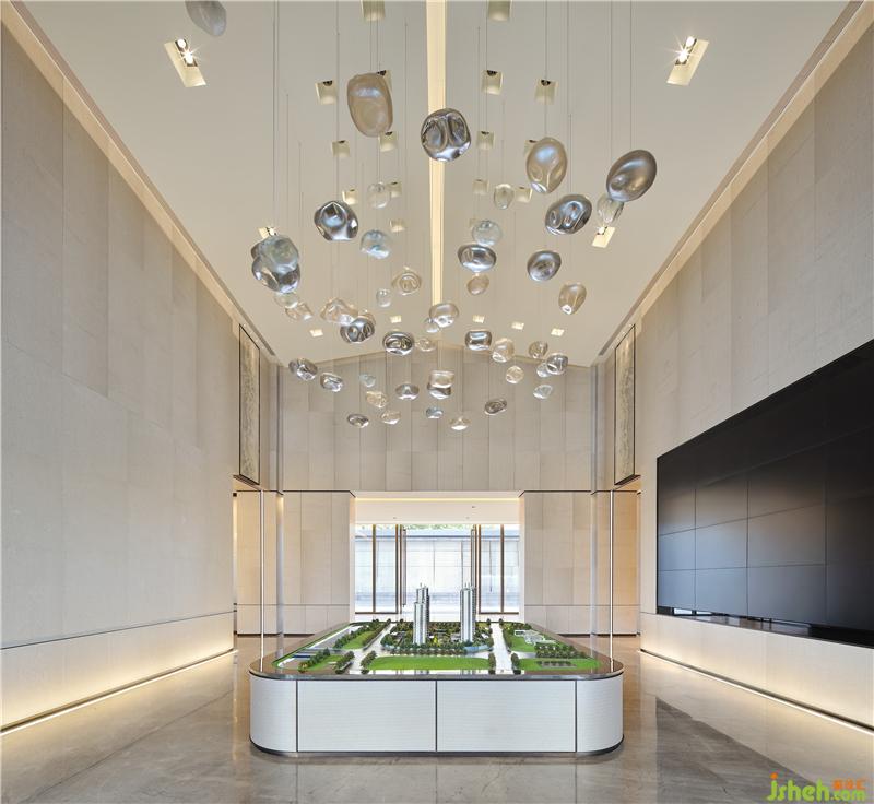 我們希望把一些中式感覺帶進(jìn)空間。在沙盤區(qū)上空懸掛玻璃吹制的吊飾,像漂浮在空中的石頭;沙盤區(qū)的空間頂面以中式屋頂元素勾勒,所有立面以及石材的切割比例,都在延伸中式卷軸畫作的意象。