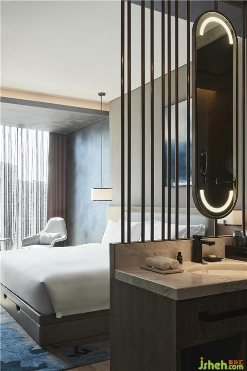 《桃花源記》的重點是“不知有漢,無論魏晉”。我們室內(nèi)設(shè)計延續(xù)“世外桃源”的意境,酒店平面設(shè)計曲徑通幽、歩移景換,在狹窄靜謐的入口玄關(guān)等待徐徐平移打開的酒店大門,同時也是在等待一曲抑揚頓挫的優(yōu)雅的酒店“水”故事樂章的開始。大門完全敞開后,展現(xiàn)給客人的是比玄關(guān)更高大和恢宏的酒店大廳,先抑后揚的空間節(jié)奏,在這里得到了完美的體現(xiàn)。隨后呈現(xiàn)給客人的是受宋朝范寬《溪山行旅圖》氣勢磅礴構(gòu)圖啟發(fā)的服務(wù)臺背景。酒店大門正對面是一個屏風(fēng),隔而不斷,承前啟后,在交通中心的大堂僅一線之隔就創(chuàng)造出一個安靜、酒店設(shè)計優(yōu)雅的大堂吧休閑社交空間。像中國園林一樣充滿了變化和驚喜。酒店室內(nèi)用材分區(qū)明確、整體,用材冷暖恰當(dāng),和諧統(tǒng)一。保持獨特的風(fēng)格,鮮明的水主題,優(yōu)雅祥和的氛圍,力求在每個客人內(nèi)心中創(chuàng)造一個世外桃源,并且,可行,可望,可居,可游。