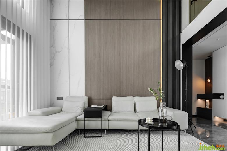 南京裝修設(shè)計(jì)開(kāi)闊大氣的挑空客廳,多元的空間層次,在簡(jiǎn)約中打造舒緩安逸的居住氛圍。