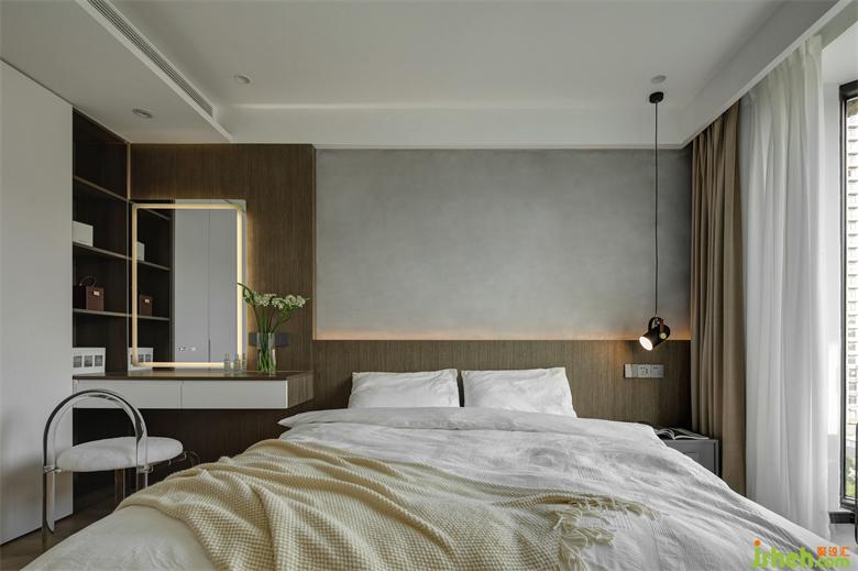 床頭背景墻采用咖色木飾面與淺灰的微水泥組合,色彩變化與材質(zhì)轉(zhuǎn)換通過燈帶緩慢而自然的過渡,南京裝修設(shè)計(jì)增強(qiáng)視覺感染力,簡(jiǎn)單的空間變得更飽滿。