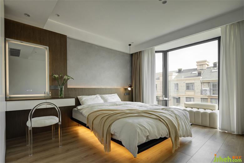 臥室與窗戶之間的地臺(tái)拆除后,呈現(xiàn)了一個(gè)大的落地窗,給人一種大氣高級(jí)的感官體驗(yàn),外面的景觀盡收眼底,絲絨軟凳+玻璃邊幾的組合,便可打造一處令人放松的休閑區(qū)。光線無遮擋進(jìn)入室內(nèi),結(jié)合無主燈的燈光設(shè)計(jì),光線的分布與照射更加均勻,南京裝修設(shè)計(jì)從視覺上拓寬了空間感。無床頭的雙人床,床底添加了隱藏式燈帶,柔和的感應(yīng)燈光使起夜更便捷,帶來一種舒緩的輕盈感。