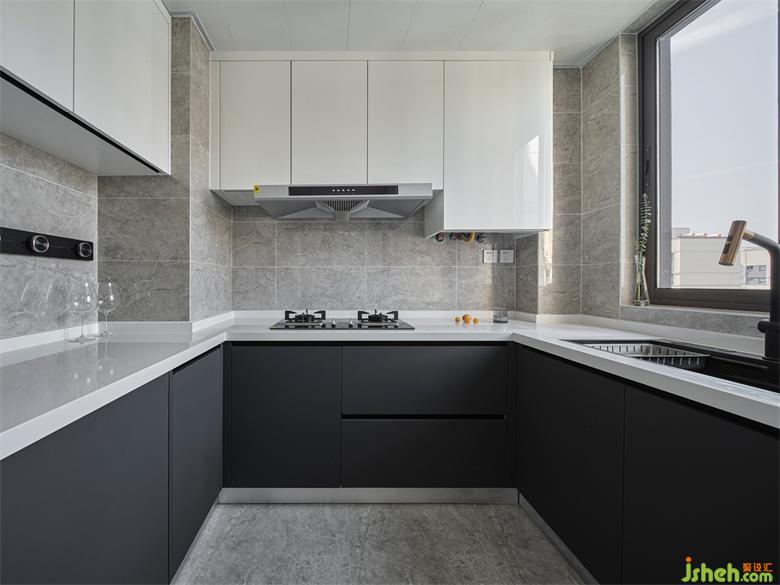 沿廚房的三面墻布局,形成一個(gè)“U”字型,為放置電器、多人同時(shí)備餐提供了更充裕的空間,操作面最大、動(dòng)線最短、空間利用率最高。南京瓏玥名邸精裝房改造采光充足的廚房空間,櫥柜采用白色吊柜+深灰色地柜的搭配,明暗色澤對比愉悅,清新中凸顯沉穩(wěn),更顯簡約風(fēng)格氣質(zhì)。