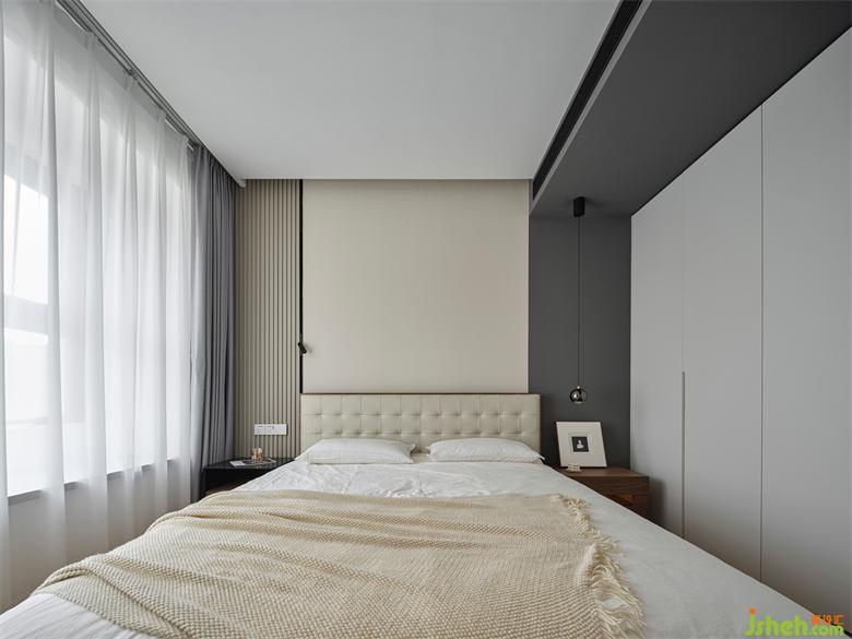 主臥在現(xiàn)代的基礎(chǔ)上,選擇了成熟穩(wěn)健的配色,床頭背景墻采用米白色+深灰色的撞色組合,搭配整排的白色衣柜,整體呈現(xiàn)寧靜和諧的氛圍;一側(cè)利用木色的格柵做裝飾,增加視覺上的層次感,簡約中更顯溫潤和設(shè)計(jì)感。南京瓏玥名邸精裝房改造購置米白色的軟包床,松軟的靠背讓倚靠更愜意,帶來滿滿的安全感。