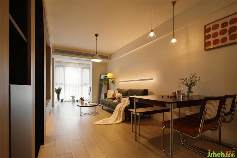 本案是一間兩居室的住宅,作為小兩口的婚房,夫妻倆+一只狗狗,婚房設(shè)計(jì)致力于打造一個(gè)理性與感性并存的溫暖居所。整屋以簡(jiǎn)約的硬裝基礎(chǔ)為基調(diào),流暢的線條,溫暖、愜意的質(zhì)感,奶白色、木色中加入多彩裝飾,復(fù)古的裝飾元素和現(xiàn)代風(fēng)格的和諧融合,婚房設(shè)計(jì)營(yíng)造出一種時(shí)尚和舒適的感覺(jué);在統(tǒng)一的3000k暖色調(diào)光源映襯下給人一種溫馨、放松之感,產(chǎn)生一種富有“人情味”的家居氛圍。