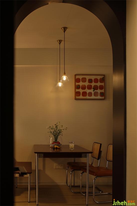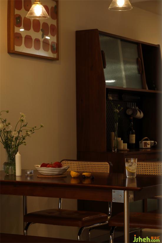 餐廳購(gòu)置了兩盞玻璃小吊燈,光影絢麗,帶來(lái)柔和溫馨的光感。餐桌+餐椅+條凳的組合方式,婚房設(shè)計(jì)將美感與實(shí)用完美結(jié)合;黑胡桃木、不銹鋼、藤編的材質(zhì)相互中和,簡(jiǎn)約中透露出復(fù)古,在視覺(jué)上呈現(xiàn)和煦輕柔的感覺(jué),復(fù)古而雅致。墻面點(diǎn)綴一幅“心想事橙”的主題掛畫,寓意誠(chéng)心誠(chéng)意、心想事成,給人以溫暖和甜蜜,與整體氛圍相契合。