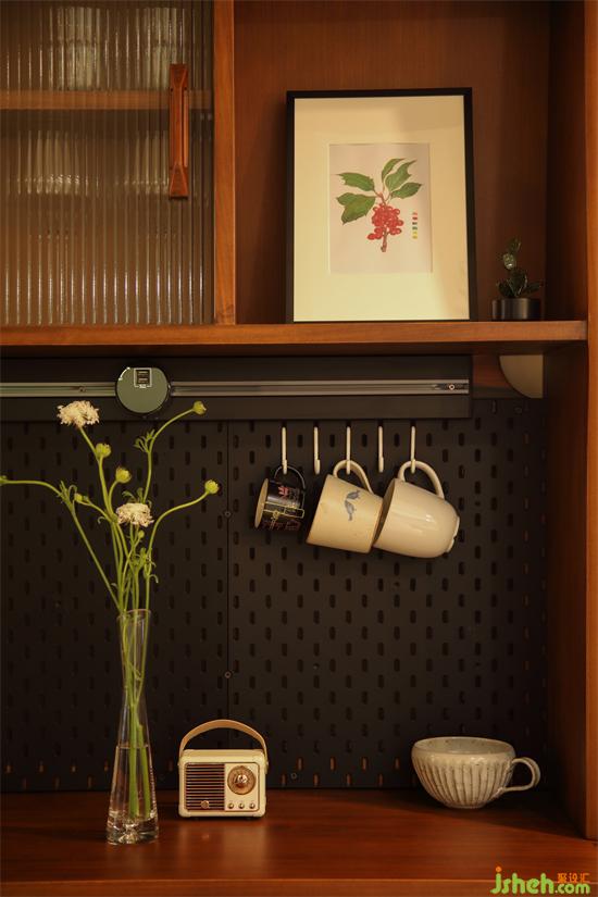 餐邊柜加入了嵌入式電力軌道設(shè)計(jì),不用擔(dān)心燒水壺、咖啡機(jī)等電源線太短啦;便捷式的洞洞板,滿足了小物品的收納需求,婚房設(shè)計(jì)結(jié)合上中區(qū)的大臺(tái)面設(shè)計(jì),整體取用更方便。