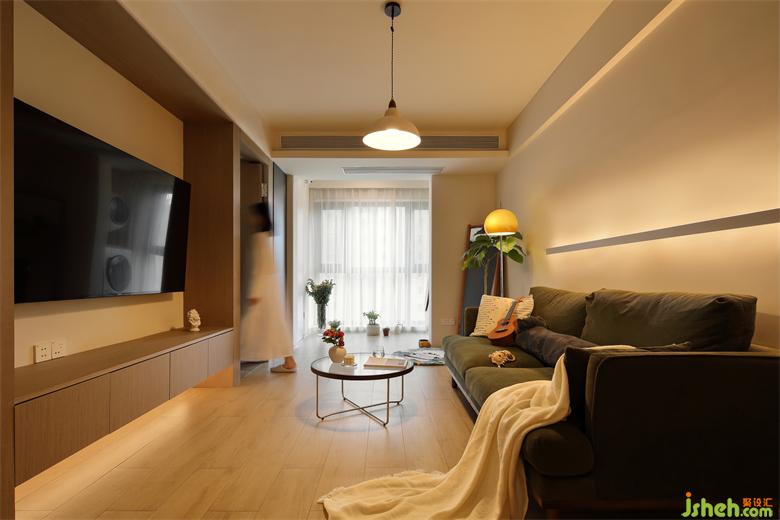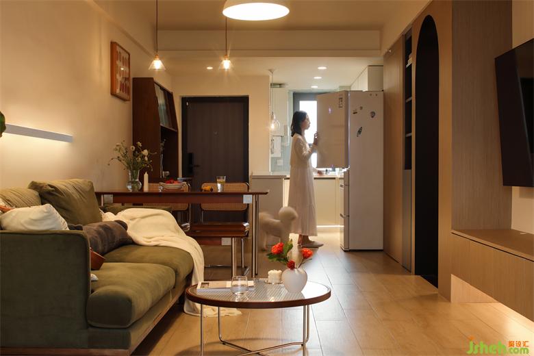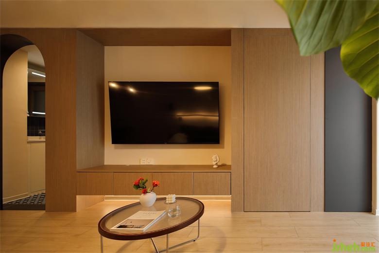 電視背景墻的四周用原木色的木飾面打造,讓奶白色的墻面多了一絲溫潤(rùn)感和自然。電視柜采用了懸空的設(shè)計(jì),不占空間,還避免了衛(wèi)生死角,將電視柜與兩側(cè)木飾面結(jié)合在一起,起到了裝飾的整體性;上方留了兩個(gè)明裝插座,方便各種多功能小電器的使用;下方加入燈帶,塑造了空間的層次感與精致感?;榉吭O(shè)計(jì)通往次衛(wèi)的門洞設(shè)計(jì)了拱形,劃分出獨(dú)立的兩個(gè)區(qū)域,柔化空間的視覺(jué)效果,提升了整屋的顏值和藝術(shù)氣質(zhì)。