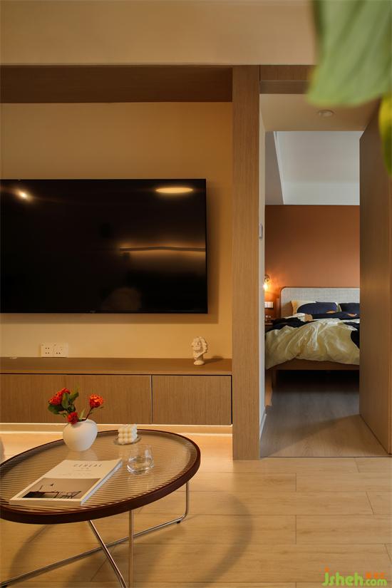 沿著電視背景墻一側(cè),進(jìn)入主臥的門設(shè)計(jì)了隱形門,分隔公共區(qū)和私密區(qū),婚房設(shè)計(jì)運(yùn)用了統(tǒng)一的原木色木飾面材質(zhì),營(yíng)造出沉穩(wěn)的自然氛圍感,給人溫暖、質(zhì)樸的體驗(yàn),無(wú)門框無(wú)把手的設(shè)計(jì)又保證了背景墻的整體性和美觀性。