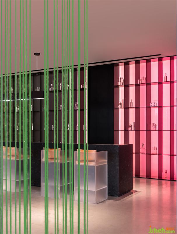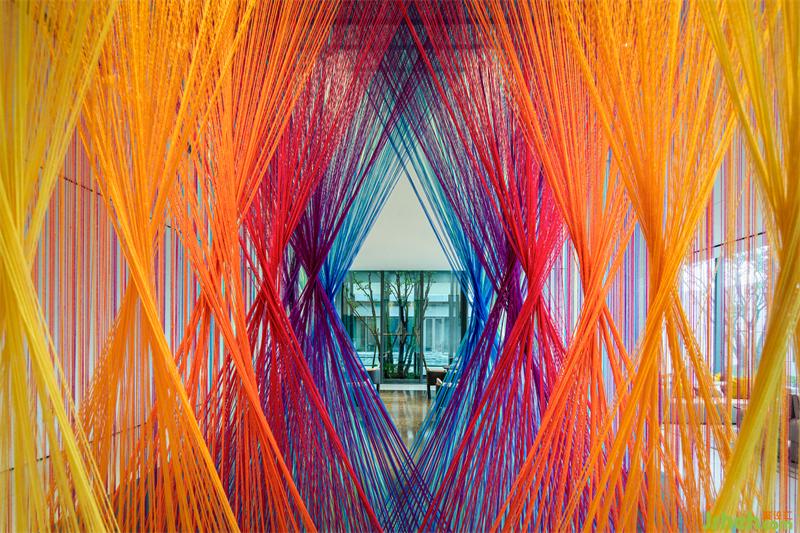 洽談區(qū)是空間故事的重心,也是折射出最絢爛光線的聚焦地。絲線的材質(zhì)和燈光的結(jié)合,展現(xiàn)出光和色彩的全新體驗,細膩的線猶如光束匯聚。在空間里非??侦`且具有感知力;極具張力的色彩打破空間的寧靜,彩虹般的色彩吸引著所有人的視覺焦點。