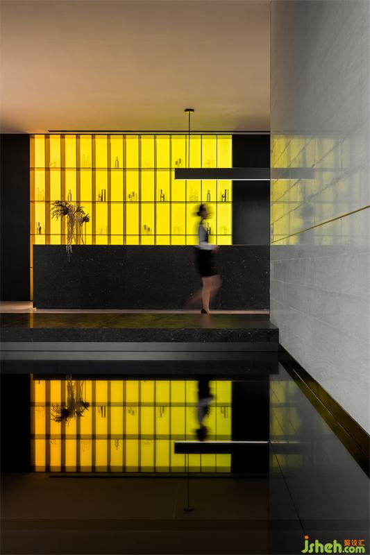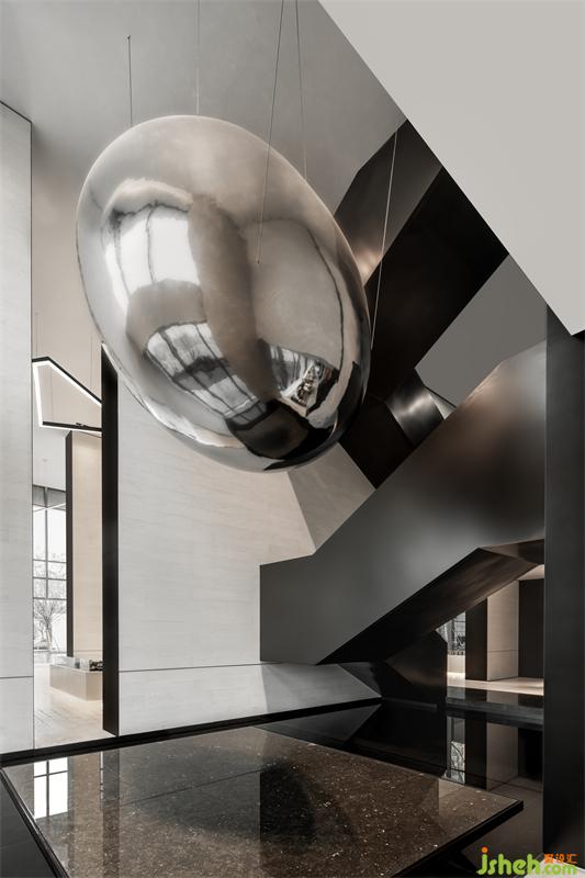 樓梯間我們利用水景與懸浮藝術裝置相結(jié)合,將端莊嚴肅的樓梯結(jié)構(gòu)趣味化,巨大的金屬球優(yōu)雅的漂浮在空中,賦予了空間以力量感,如同海面濺起的水珠,溫軟,感性,水珠映照著周邊的環(huán)境,平衡著樓梯間的節(jié)奏。