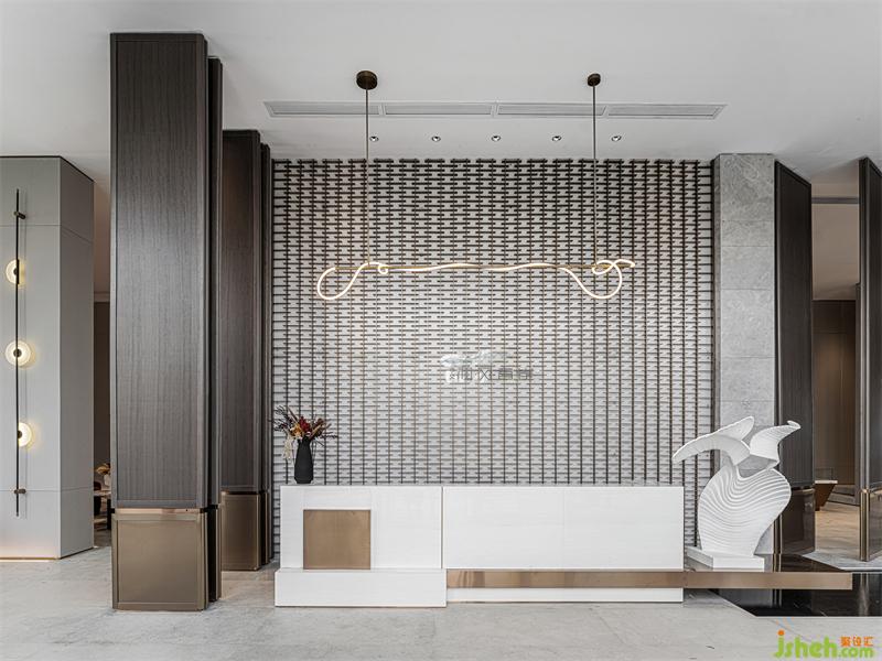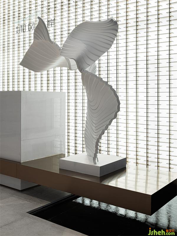 售樓部設計中入門空間用于調動參觀者的情緒,極具構成感的形式,強化了空間的節(jié)奏,選擇關聯(lián)的元素和形態(tài)上的優(yōu)雅,感受純粹的力量?;没療o窮的“水”形態(tài),被線條感,抽象化的自然美學形態(tài)呈現(xiàn)在了空間中。
