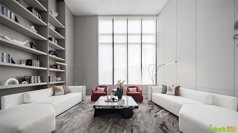 大面積的書架拔高空間,圍合的家具則凝聚著十足的雅趣。造型簡潔的藝術(shù)裝置呼應(yīng)了以“水”為主題的空間形態(tài),沙發(fā)組整齊有序,端莊素凈,一塵不染,自然采光與室內(nèi)燈光的結(jié)合,折射出空間的硬朗,氣質(zhì)是明朗的,簡約無飾,卻吸引著人們探索更多。