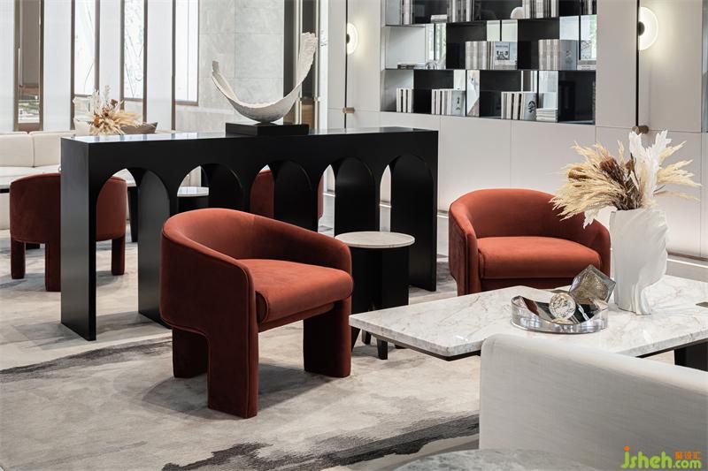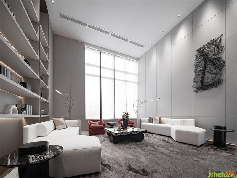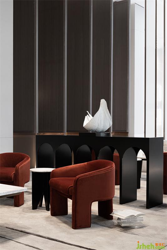 在開敞的空間形成段落兜轉(zhuǎn),通過兩側(cè)不同的光影、明暗的過濾,傾瀉于此的自然光更顯時(shí)光的分量。光影錯(cuò)落有致,沙發(fā)組凸顯質(zhì)感品質(zhì),點(diǎn)綴紅色洽談椅用來平衡空間的重量,它或深沉或內(nèi)斂,衍生功能的秩序,空間在低吟淺誦中建立微妙的靜態(tài)平衡。