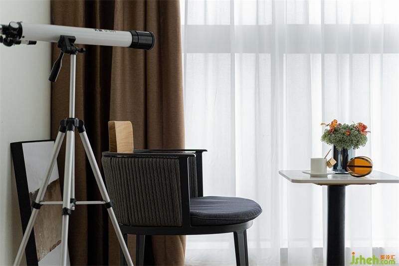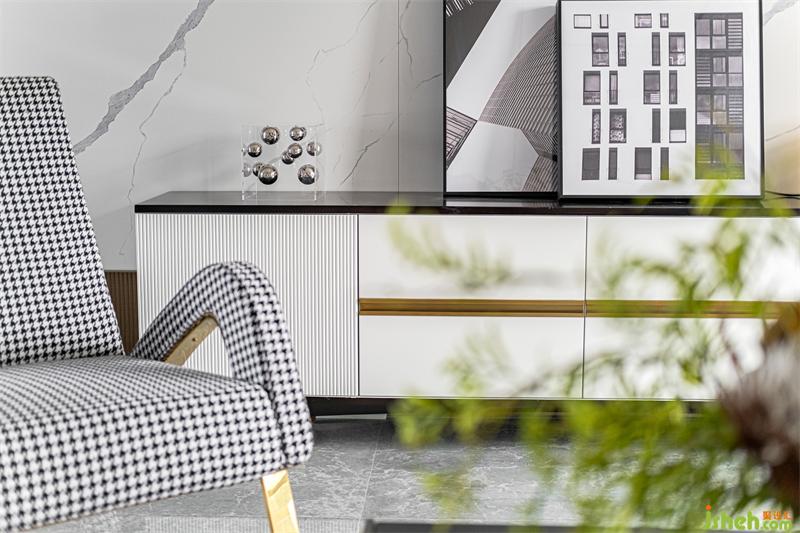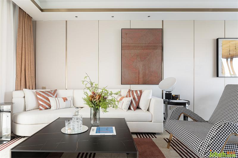 樣板房設計契合背景墻的米色沙發(fā)自帶高級氣場,配合黑白格紋加金屬單人椅,幾何造型打破黑色大理石茶幾的冷冽感,表達溫馨和藝術氛圍。紋路清晰的玻璃器具與跳脫的金屬擺件相碰撞,裝點空間的同時,形成強有力的視覺沖擊。