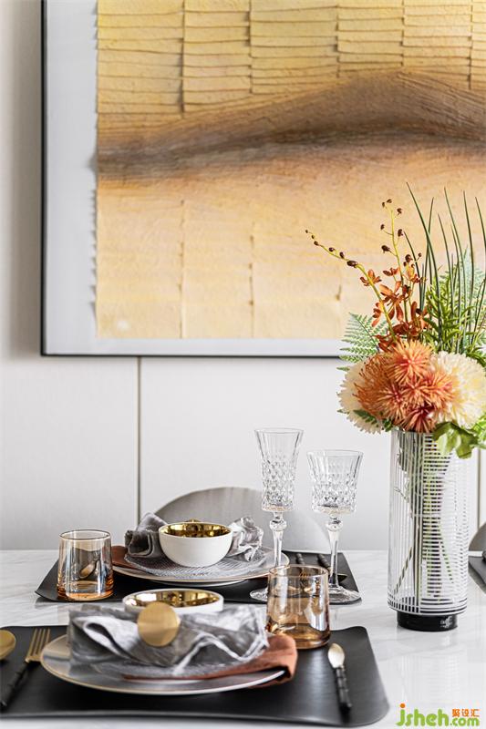 典雅的高級灰調中加入體現(xiàn)都市輕奢感的水晶和金屬色作為點綴,空間追求品質,舒適與放松的氛圍,材質與植物綠色的自然氣息,更得以體現(xiàn)放松,愜意的現(xiàn)代生活方式。我們對細節(jié)的考量貫穿著空間的始終,每一件珍藏都儀式感滿滿,讓就餐成為空間畫面中美好的情緒所在。