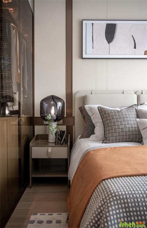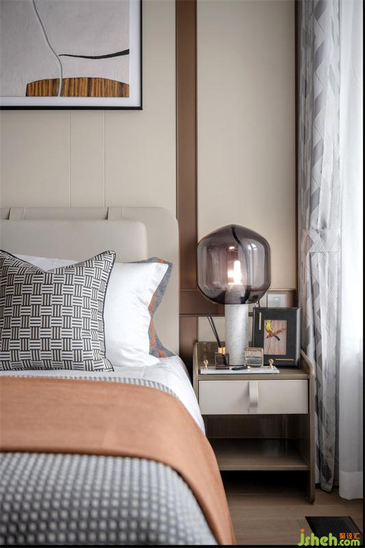 空間是有溫度和氣質(zhì)的,需要居者親自抵達,細細領會。主臥打造時尚優(yōu)雅的中性色調(diào),局部點綴橘色床品與擺件,一剛一柔,細節(jié)處混搭的撞色為空間注入活力,更顯層次感,讓光線參與設計,臥室在光環(huán)境的二次營造中悠然打開,整個空間都統(tǒng)一在柔和溫馨與自然當中。