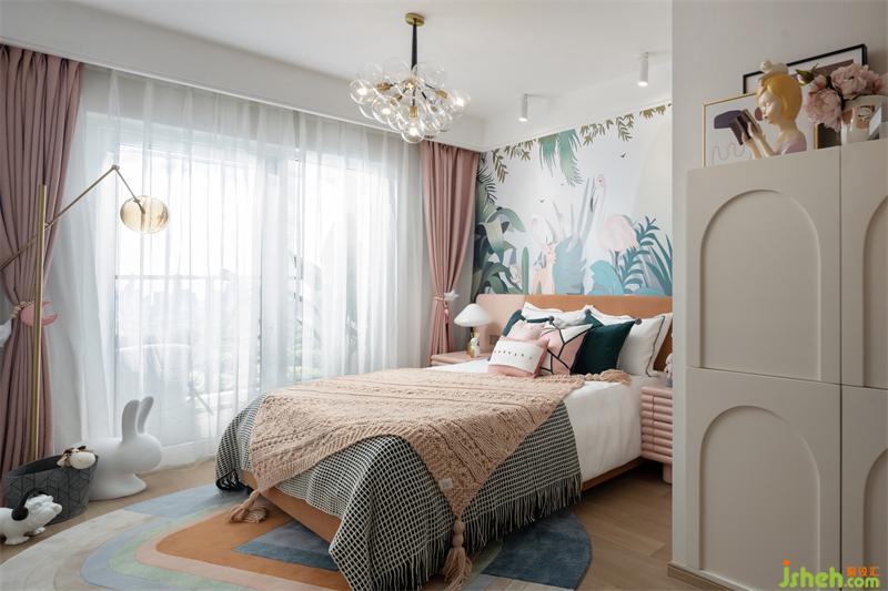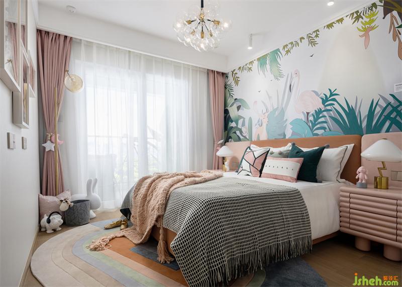 女孩房仿若走進(jìn)鳥語花香的叢林,是對童趣的解讀與純粹自然生態(tài)相結(jié)合,圍繞叢林小公主展開童夢空間,構(gòu)成小主人與大自然的親密互動場景。