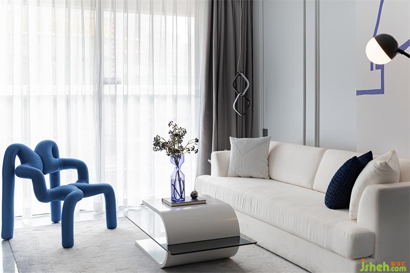 整個空間的色彩材質(zhì)以高級灰結(jié)合局部藍色點綴為主,家具運用高級面料布藝,與大理石金屬等材質(zhì)的碰撞,提升空間品質(zhì)與層次,藍色所表現(xiàn)的沉穩(wěn)冷靜,體現(xiàn)居家的精致氛圍,讓整體空間更具藝術(shù)性。