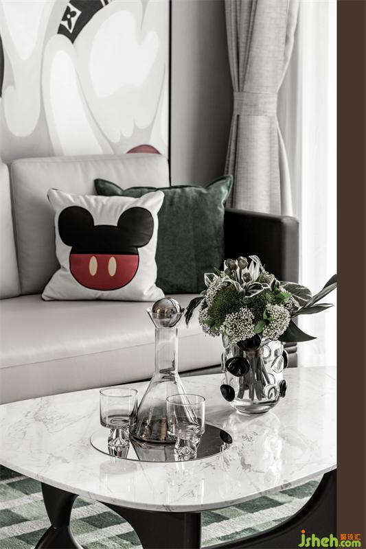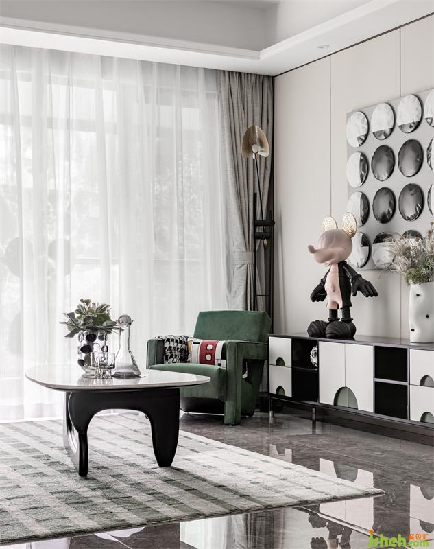樣板房設(shè)計(jì)以黑白灰為大面積襯托色,復(fù)古綠為點(diǎn)綴色,少部分運(yùn)用金色拉開空間的層次感,適當(dāng)運(yùn)用復(fù)古綠延續(xù)到其他空間,色彩就像是一幅畫,是畫更是悠然愜意的生活方式。