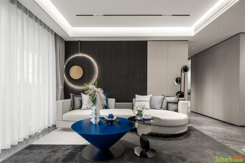 寧靜之藍(lán),生活之味,個性的藍(lán)將客餐廳一體貫通,空間瞬間流動起來,映襯著藍(lán)色的個性茶幾,黑色簡潔的沙發(fā)背景墻也與幾何裝飾的墻飾冷暖互補,強(qiáng)調(diào)了空間的秩序感和節(jié)奏感。