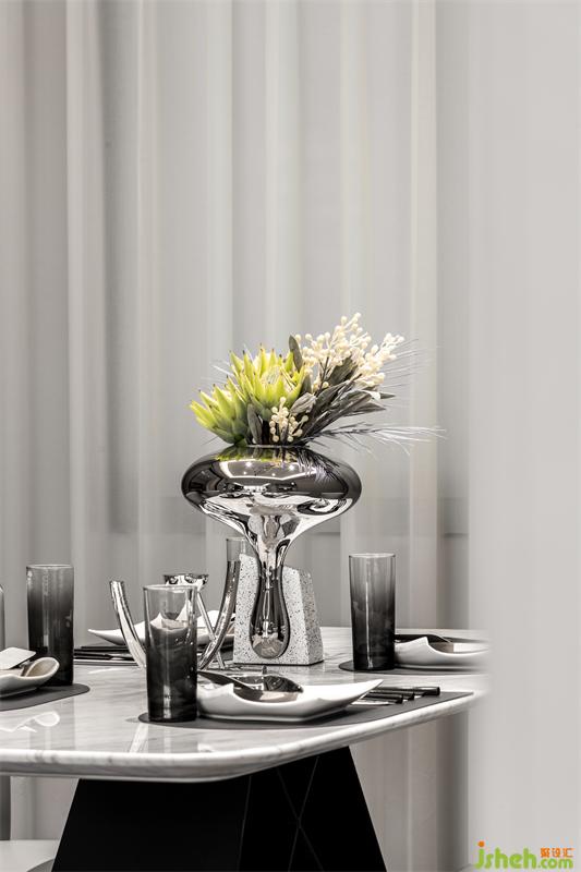 餐桌與餐椅的設(shè)計都極為簡約,把舞臺留給家的煙火氣。銀色花器與餐具精致搭配,精致藏于細(xì)節(jié)。