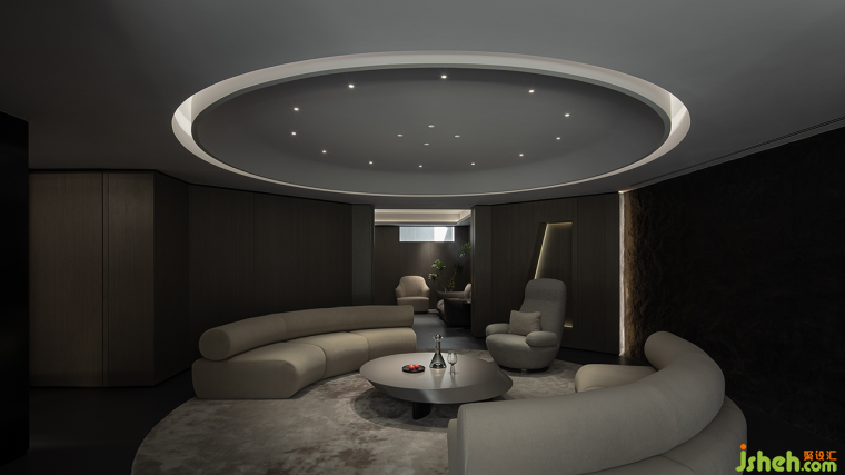 若是夜深人靜,親友相聚依然有天地可容。自然采光的休閑區(qū)以整潔的灰色靜觀人情冷暖,幾株樹(shù)木與躍動(dòng)的火焰成為不變的風(fēng)景,賦予空間靈動(dòng)與趣味。會(huì)客廳的圓弧形穹頂灑下點(diǎn)點(diǎn)星光,搭配同形的沙發(fā),營(yíng)造出浪漫與溫柔的氛圍。