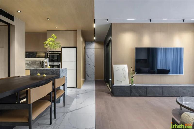 把和諧平衡的精神之美,轉(zhuǎn)化到空間的具體形式,從天花到房間對開門到地面材質(zhì)都用了對稱均衡設計,除了反映陰陽平衡概念,也考慮到使用功能,廚餐區(qū)域雖然沒有實體的分割,但通過材質(zhì)的拼接,視覺上形成功能分區(qū),給人以工整、大氣、和諧之感,變成了獨有的生活美學。
