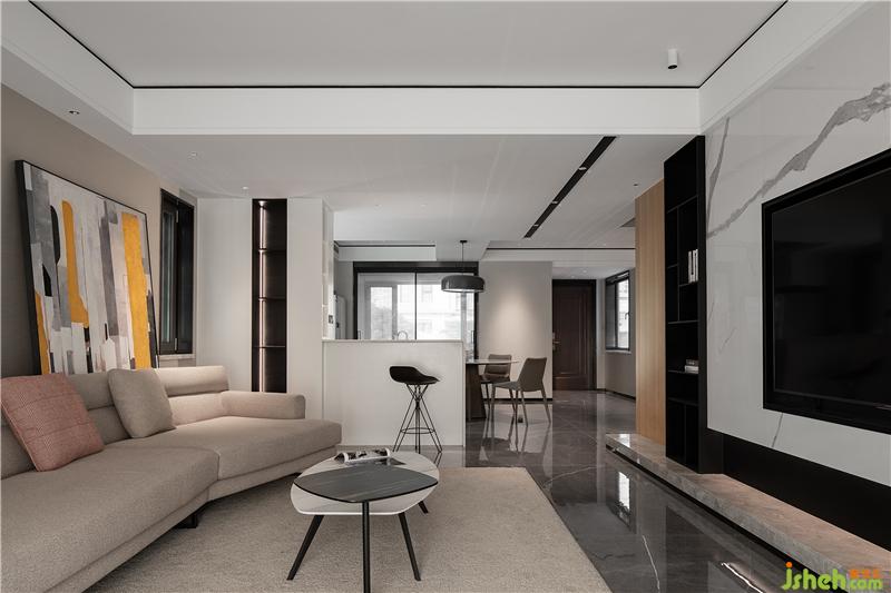 電視內(nèi)嵌入銀白色大理石內(nèi),沉穩(wěn)的黑色矩形收邊,沒有多余的線條,使得空間氛圍更加沉穩(wěn)且易打理。