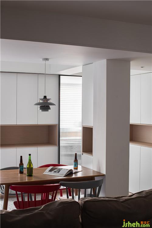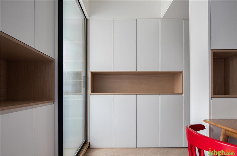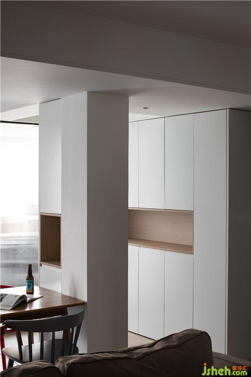 ▲屋內(nèi)的每一面墻,設(shè)計(jì)師都沒(méi)有放過(guò),將其設(shè)計(jì)為儲(chǔ)物柜。白色柜面將其體量感弱化,木色橫斷在增加擺放展示空間的同時(shí)南京裝修設(shè)計(jì),打破了柜子的擁堵感,使其在視線上更加靈巧。