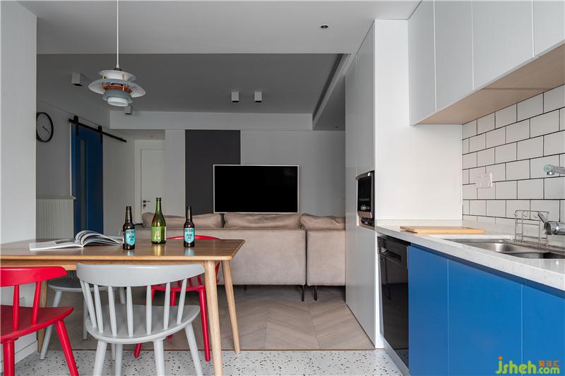 ▲廚房櫥柜的藍(lán)色與客廳相呼應(yīng),形成色彩豐富卻不雜亂的統(tǒng)一
