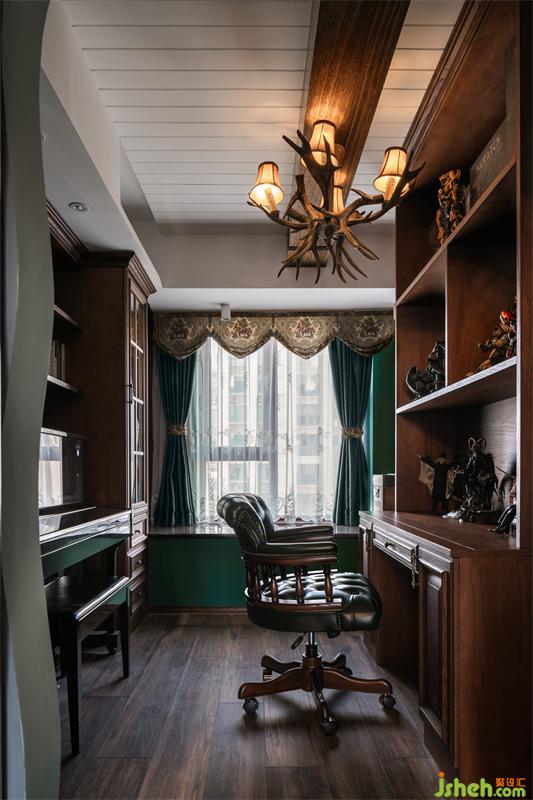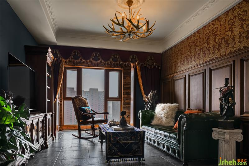 客廳采用了古堡里常用的墻板搭配大馬士革壁紙,華麗又復(fù)古,地磚也用了仿古磚,增加一點粗獷和滄桑感,沙發(fā)選用了墨綠色的切斯特菲爾德沙發(fā),搭配一把皮質(zhì)的搖椅,搖椅的靠背是皮毛的,溫暖又野奢,粗獷又舒適。沙發(fā)兩邊的手辦是家里最大號的兩個,用自己的心愛之物當(dāng)裝飾,家就有了自己的味道。