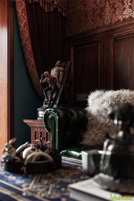 墻紙窗簾都用了復(fù)古的酒紅色系,與墨綠相碰撞,這種高飽和度的顏色對比更能體現(xiàn)古堡和宮廷的華麗和張揚,絲絨和羊毛材質(zhì)搭配溫潤的木頭,又能增加空間的質(zhì)感,更貼合古堡的風(fēng)格,茶幾上的暗黑小丑兔邪惡又迷人~強行入鏡。