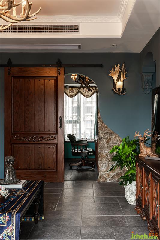 客廳看主臥。雕花的橡木谷倉門,搭配裸露出原石的破敗墻腳,仿佛一個久久無人問津的古堡里,隱藏著一個跨世紀(jì)的驚天大秘密……(此處有bgm~)鹿角壁燈昏暗的燈光既增加氛圍,也能在晚上照亮過道這一主動線,有顏又實用。