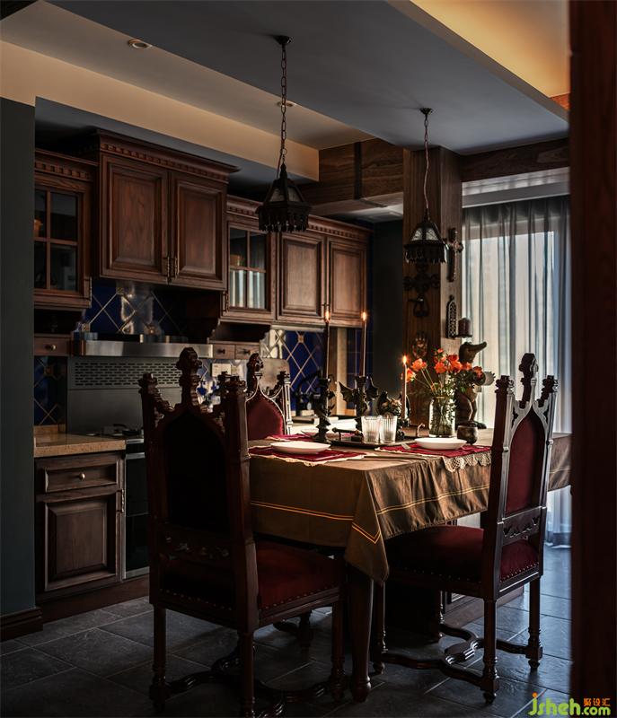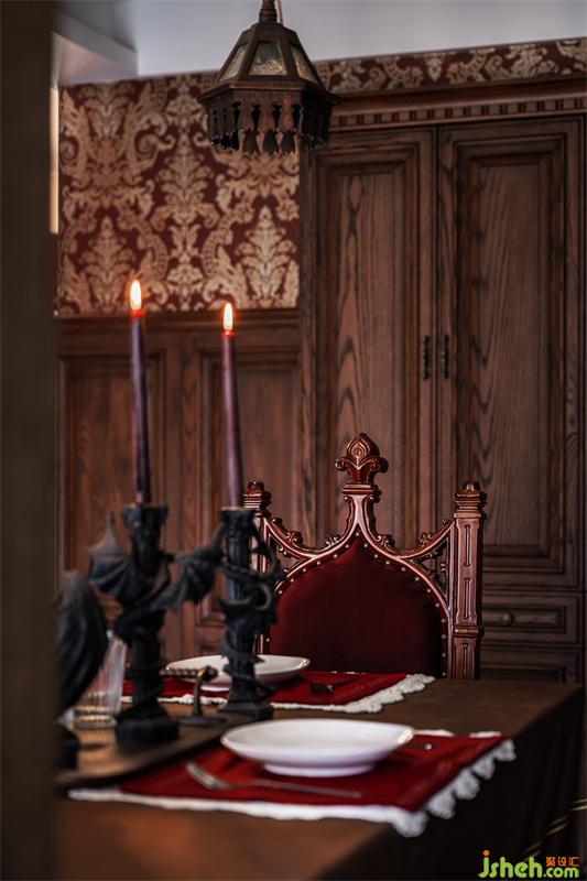 絲絨餐布與餐椅相呼應(yīng),木頭雕花和布藝的柔美都體現(xiàn)出對(duì)細(xì)節(jié)的追求,燭火和大馬士革的墻紙相映襯,唯美又溫馨,桌上的燭臺(tái)是西方代表邪惡的惡龍,暗黑又有趣。把喜歡的東西融入生活的點(diǎn)點(diǎn)滴滴,也是很幸福的一件事。