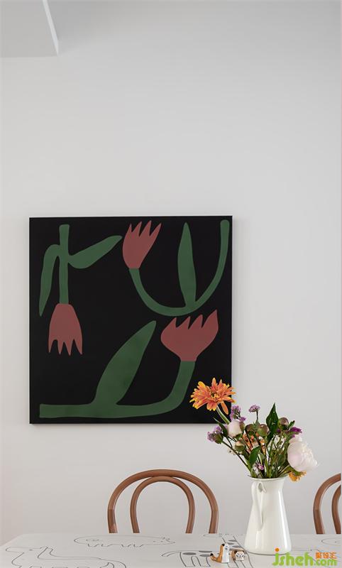 充滿(mǎn)童真的桌布和掛畫(huà)相呼應(yīng),透露出家的煙火氣。掛畫(huà)“不會(huì)凋零的花”來(lái)自英國(guó)藝術(shù)家Marcello Velh。