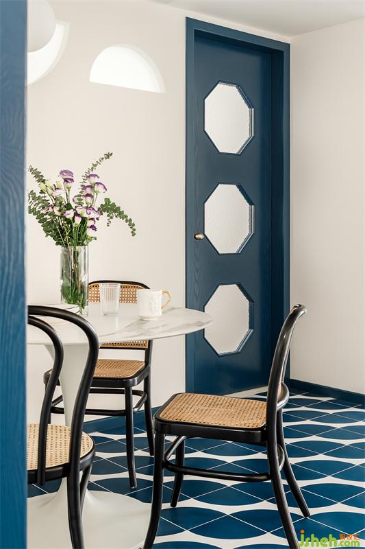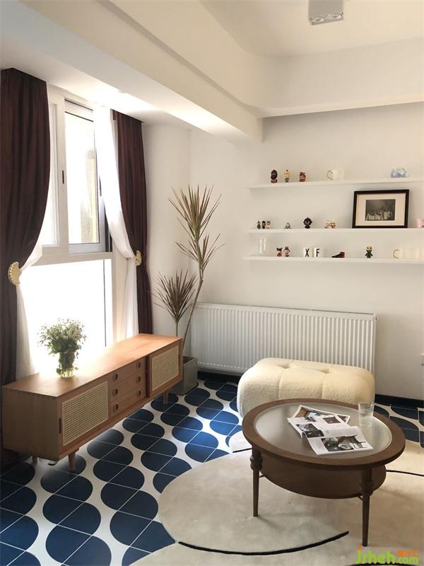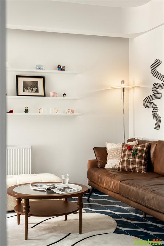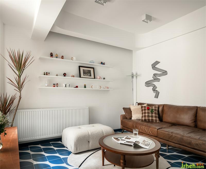 客廳地面貼了幾何形狀的地磚,讓空間更有動感。一進門就能看到的墻面上做了層板架,放置主人從各地收羅來的紀(jì)念品和公仔,打破了傳統(tǒng)的“沙發(fā)背景”和“電視背景”的背景墻模式。