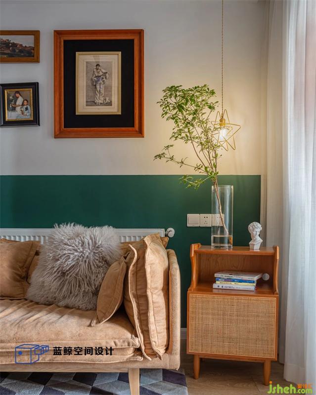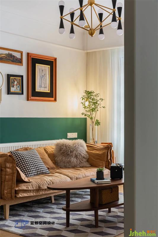 墨綠色的半墻設(shè)計(jì)增加了空間的延伸感,配上棕色的沙發(fā)立馬提升了復(fù)古感。武漢家居設(shè)計(jì)因?yàn)閴w有凹凸,電視柜是現(xiàn)場(chǎng)做的,噴了溫暖的奶茶色,顯得愜意而溫暖。沙發(fā)背后的掛畫出自故我今我。