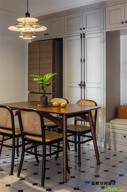 門廳做了一排餐邊柜,把冰箱和換鞋凳也收納進(jìn)來(lái),柜內(nèi)做了酒插,方便備點(diǎn)好酒招待三兩好友,柜外用了復(fù)古天地鎖,小小細(xì)節(jié)也能提升空間質(zhì)感。武漢家居設(shè)計(jì)地面是經(jīng)典黑白小磚拼花,配上Thonet的復(fù)刻藤編椅子,和PH5吊燈,文藝?yán)寺母杏X油然而生。