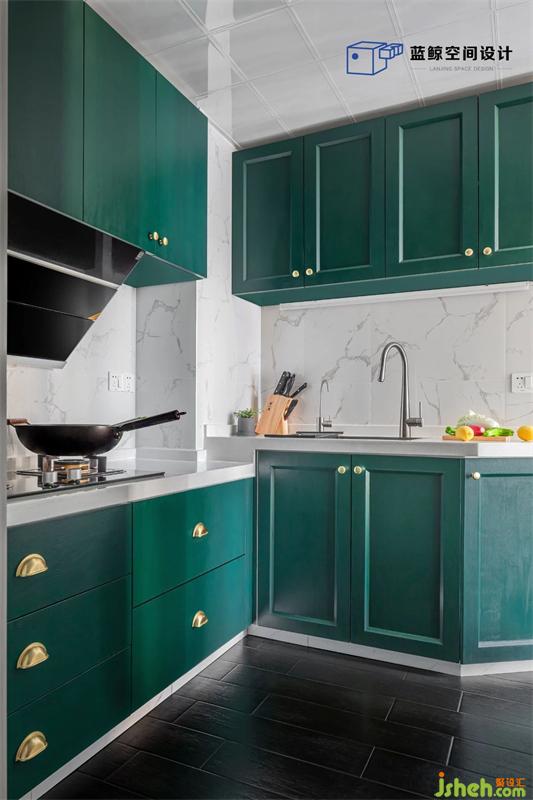 墨綠色的櫥柜配金色的拉手,廚房這種煙火氣重的地方也要注重顏值。高低櫥柜滿足不同功能所需的不同高度。