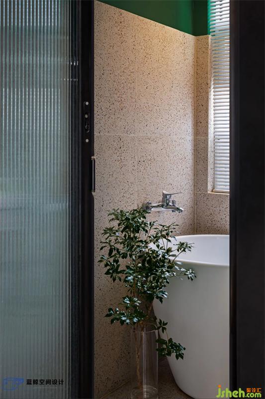 浴缸也是女業(yè)主心心念念的,78平的戶型,在通過(guò)干區(qū)外置之后,得以實(shí)現(xiàn)了浴缸,武漢家居設(shè)計(jì)為了節(jié)省空間,門采用了折疊合金門,雙面長(zhǎng)虹玻璃保證了隱私又能輕微透光,顏值也能兼顧。衛(wèi)生間內(nèi)部使用了仿水磨石的磚,墻地磚統(tǒng)一,墻體上半部分和頂面統(tǒng)一刷了墨綠色的衛(wèi)浴漆,呼應(yīng)了客廳,又避免了墻磚、地磚、頂面三種材質(zhì)而顯得衛(wèi)生間更加狹小雜亂。