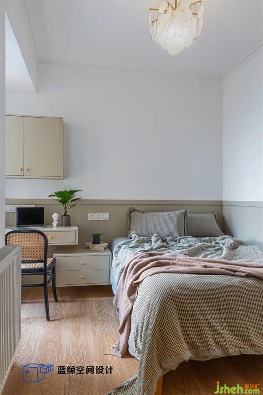 主臥用了低飽和度的綠色,呼應(yīng)客廳的主題色,進(jìn)門右手是整排的衣柜,也運(yùn)用了電視柜的奶茶色。梳妝臺(tái)出自二黑木作,收納能力強(qiáng)大。