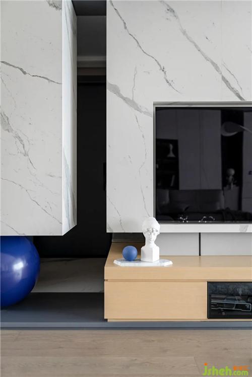 玄關墻面用墻布和電視柜轉折木飾面形成自然的換鞋凳區(qū)域,結構的轉折延伸,帶動了空間的起承轉合。球體托起柜子的形式,跟周圍方正穩(wěn)定的空間形成強烈的視覺對比,視覺沖擊力加強,并讓空間有了動感和趣味性。頂部的軟膜天花是感應的開關,出光均勻,讓玄關使用時,照明得到了補充。