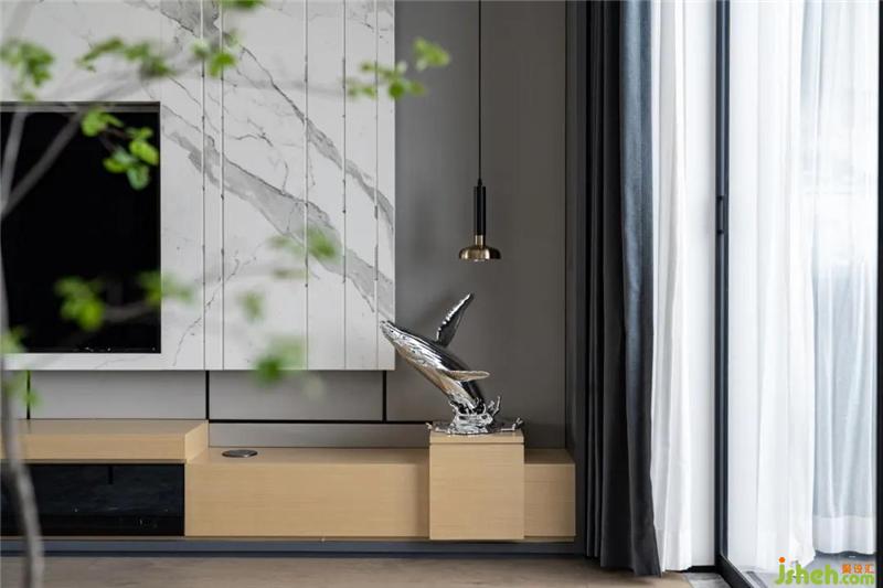 簡約線條感的吊燈搭配“鯨躍”的金屬雕塑,質感拉滿。
