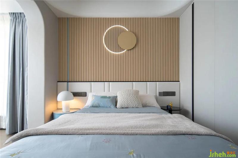 兒童房床頭是硬包+長城板的組合,圓形的裝飾燈與蘑菇燈弱化了生冷的線條感,以局部的藍(lán)色作為點(diǎn)綴,彰顯童趣。深圳室內(nèi)設(shè)計師四件套可根據(jù)日后小朋友的喜好更換,無需變動硬裝,相對更加節(jié)約成本。