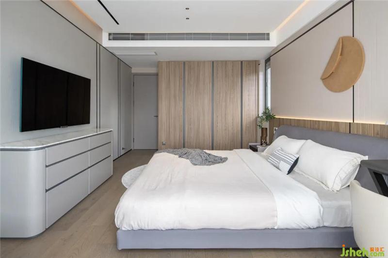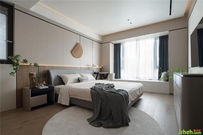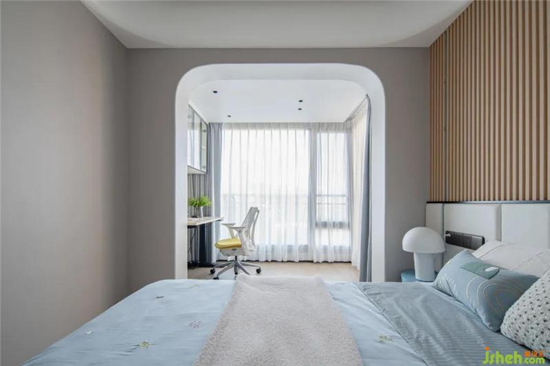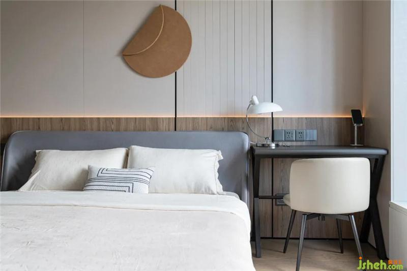 床頭兩側(cè)做了床頭柜+小辦公桌的設(shè)計區(qū)分功能。房間不管是衣柜、床頭背景或是地板均輔以木材,溫馨也更環(huán)保健康。細(xì)看鋼條點(diǎn)綴細(xì)節(jié),以致于不那么沉悶。