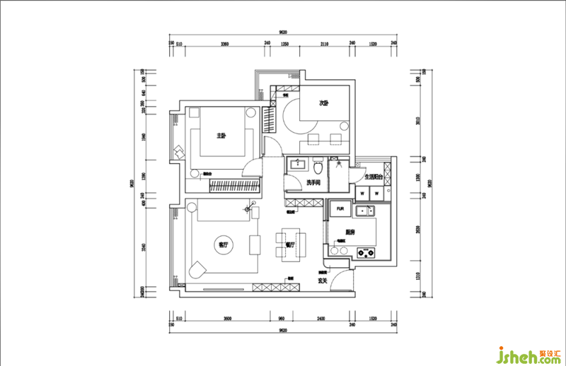 2. 公衛(wèi)采光差,無法做到干濕分離,洗衣機放置在廚房外的生活陽臺,無隔離油煙多