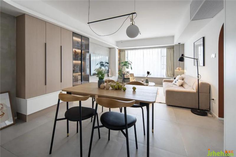 根據(jù)屋主的需求,設置了餐邊柜,白色的柜體與墻面融為一體,視覺上干凈整體,做了部分開放處理,預留了插座放置飲水機,讓生活更加便捷。
