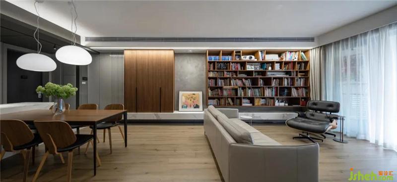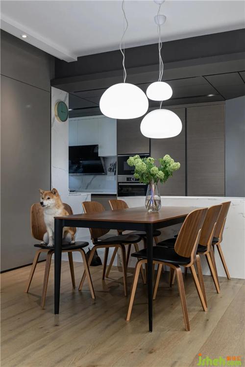 材質(zhì)上,我們都喜歡溫暖的木材,尤其是黑胡桃木的花紋在空間里反復(fù)出現(xiàn)——柜子、餐桌椅、單人沙發(fā)。深圳裝修設(shè)計地板和廚房柜子用了淺一點的木色,形成豐富的層次。其它顏色則都是中性色:白色的雪花白巖板和餐廳吊燈,灰色的墻面和沙發(fā),以及黑色局部,共同構(gòu)成了客餐廳簡潔、溫暖、低調(diào)的風(fēng)格。這種風(fēng)格也延續(xù)到整套房屋。