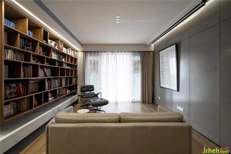 經(jīng)典的Eames躺椅成了全家最愛的角落,人體工學(xué)的精準(zhǔn)設(shè)計帶來舒適的坐感。窩在里面看本書或者看部電影,都十分愜意。書架下面兩層放了小朋友的書,他喜歡自己在書架上找書看;上面四層則放了大人的書,最上層還收納了投影儀和小型音響。
